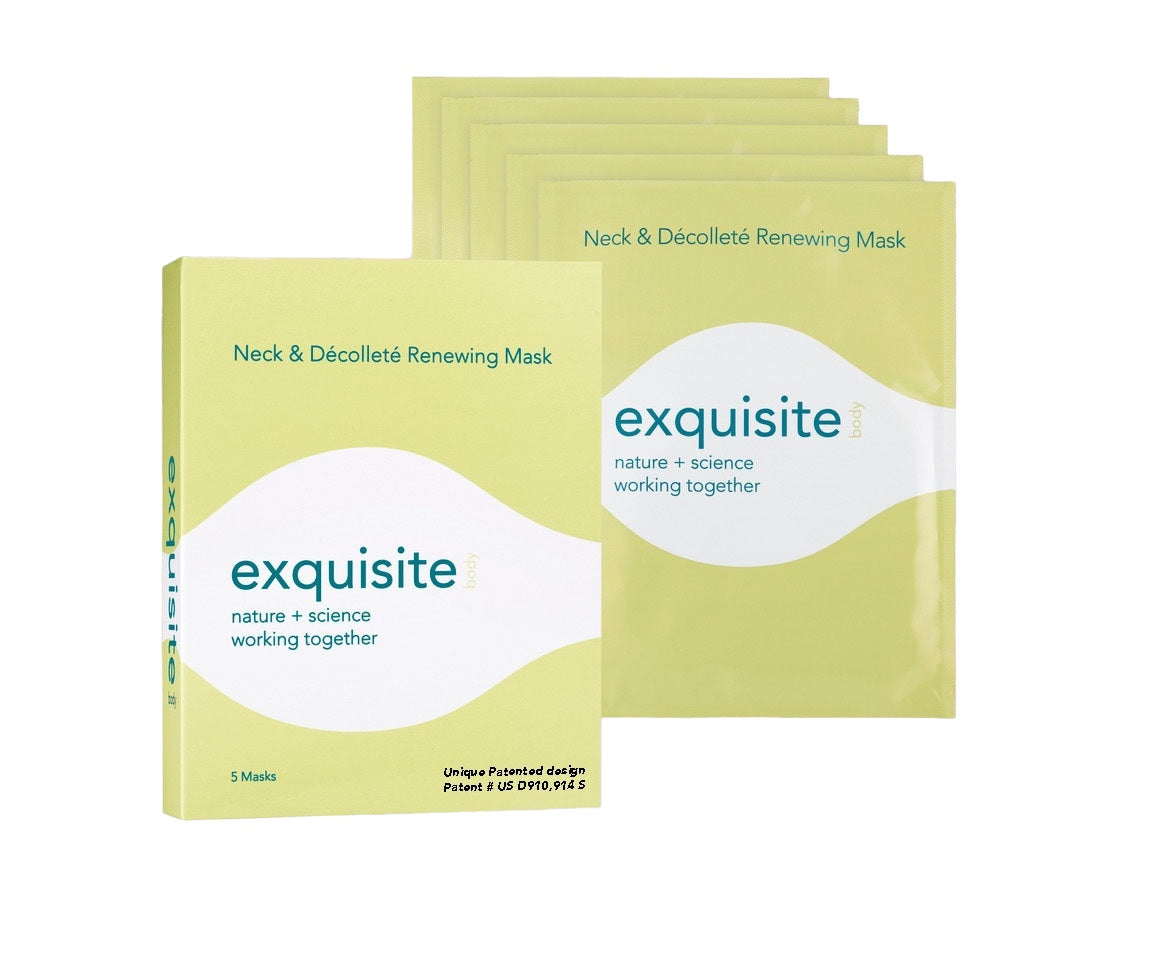Exquisite's patented-shape bio-cellulose mask fits the curves and contours of your neck and décolleté like a second skin. The advanced design ensures optimal performance of our active hydrogel formula, powered by a combination of a cutting-edge marine peptide, brightening Vitamin C, and antioxidants. This deeply restorative treatment hydrates and leaves your entire neck and décolleté feeling dramatically smoother, brighter, firmer, and more supple…exquisite.